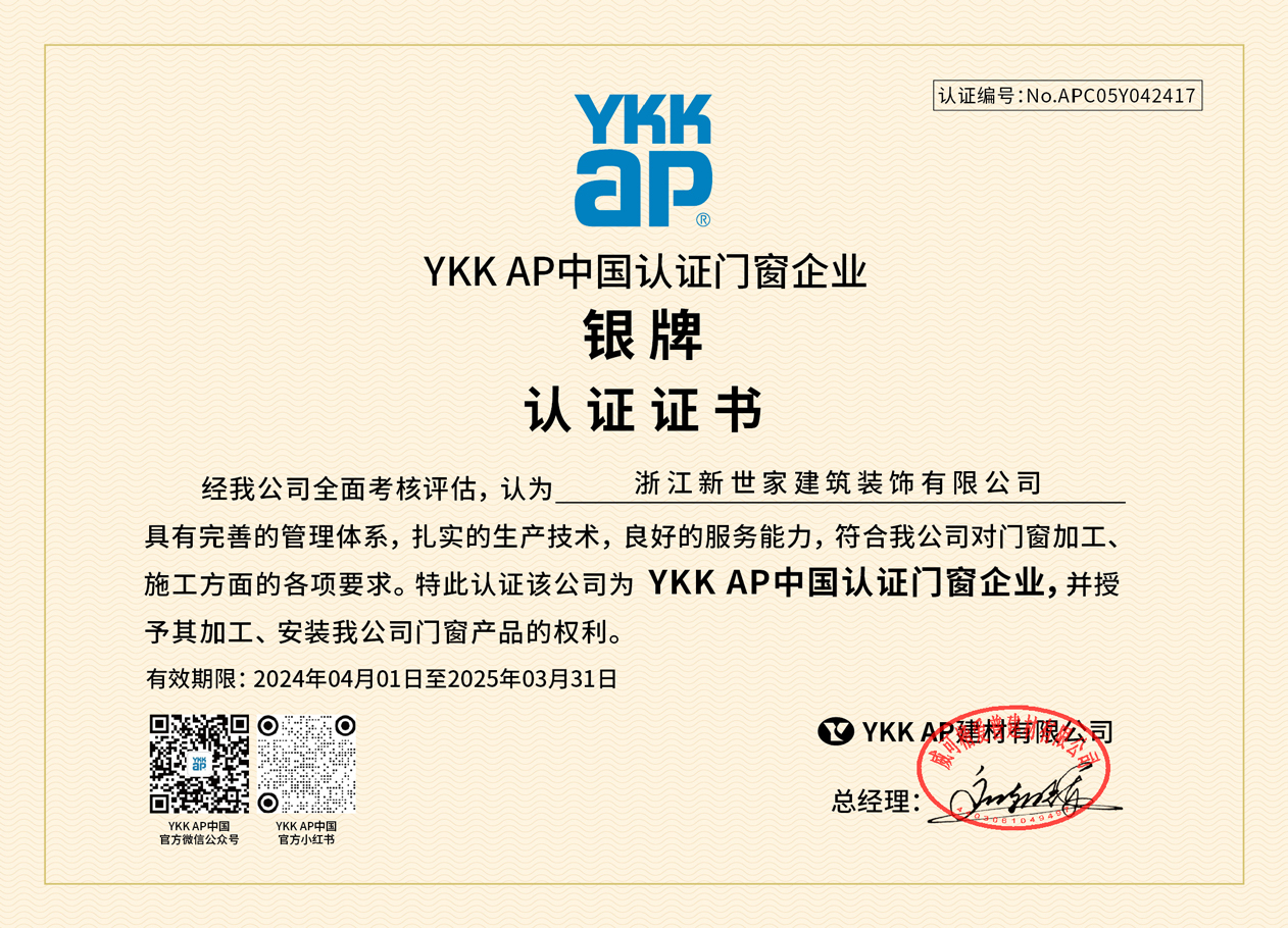 鋁合金門窗 銀牌 寧波 浙江新世家建筑裝飾有限公司 2024/4/1-2025/3/31